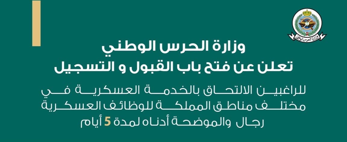 تعلن وزارة الحرس الوطني عن فتح باب القبول والتسجيل للراغبين في الالتحاق بالخدمة العسكرية (بمختلف مناطق المملكة) لشغل الوظائف العسكرية الحالية (للرجال) من حملة مؤهلات (الثانوية، الدبلوم، البكالوريوس)، وذلك وفق التفاصيل التالية: