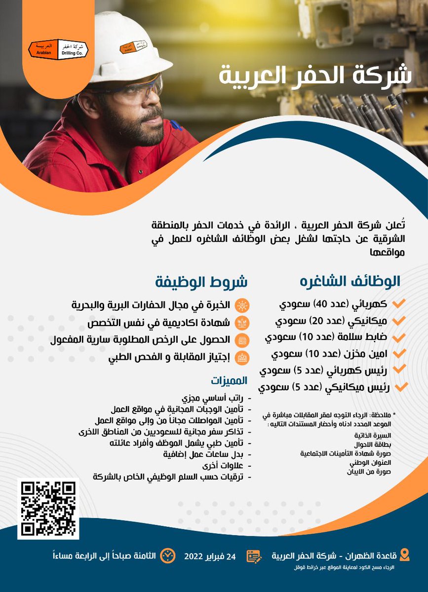 تعلن شركة الحفر العربية للبترول عن حاجتها لشغل وظائف شاغرة للعمل في مواقعها بالمنطقة الشرقية وفق المسميات الوظيفية التالية: