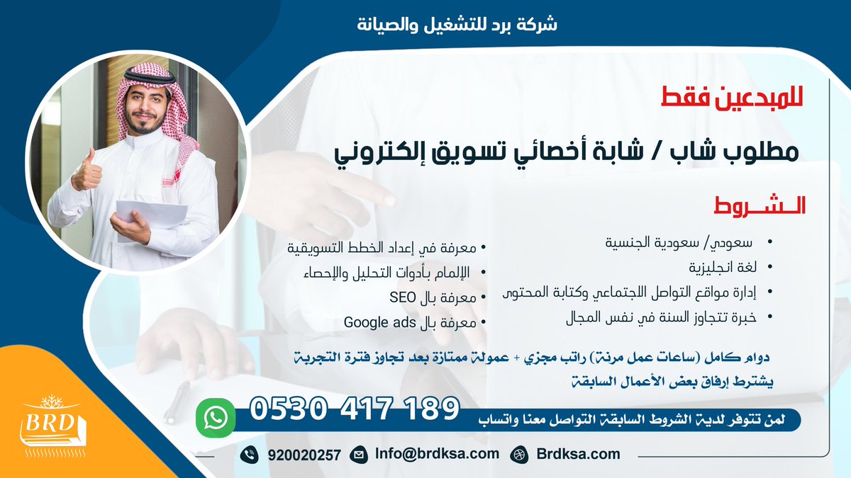 تعلن شركة برد للتشغيل والصيانة عن توفر وظائف للرجال والنساء في مجال التسويق الرقمي للعمل في مدينة الرياض وفق الشروط التالية: