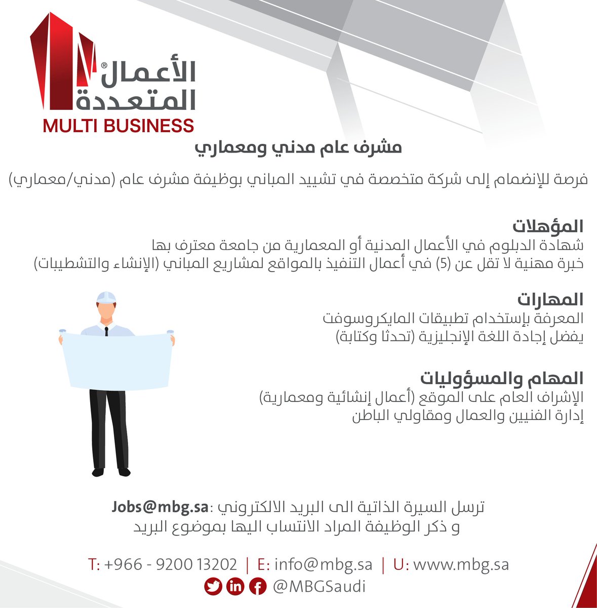 تعلن شركة الأعمال المتعددة عن توفر وظيفة هندسية شاغرة لحملة الدبلوم بمسمي وظيفة مشرف عام (مدني / معماري)، وذلك للعمل في مدينة الرياض وفق الشروط التالية: