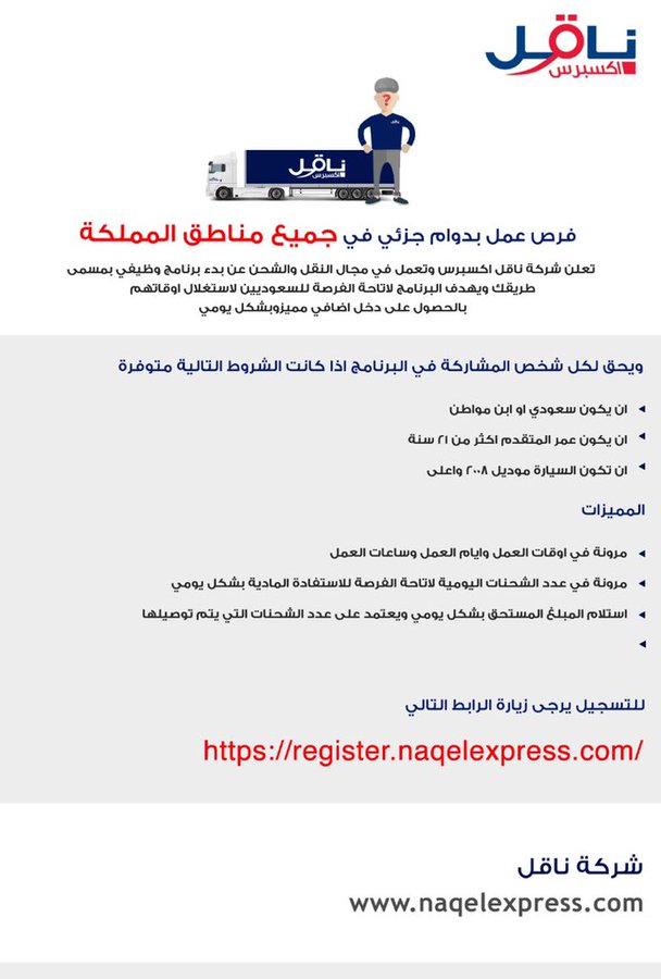 شركة ناقل اكسبرس وظائف دوام جزئي بجميع مناطق المملكة دوام كامل